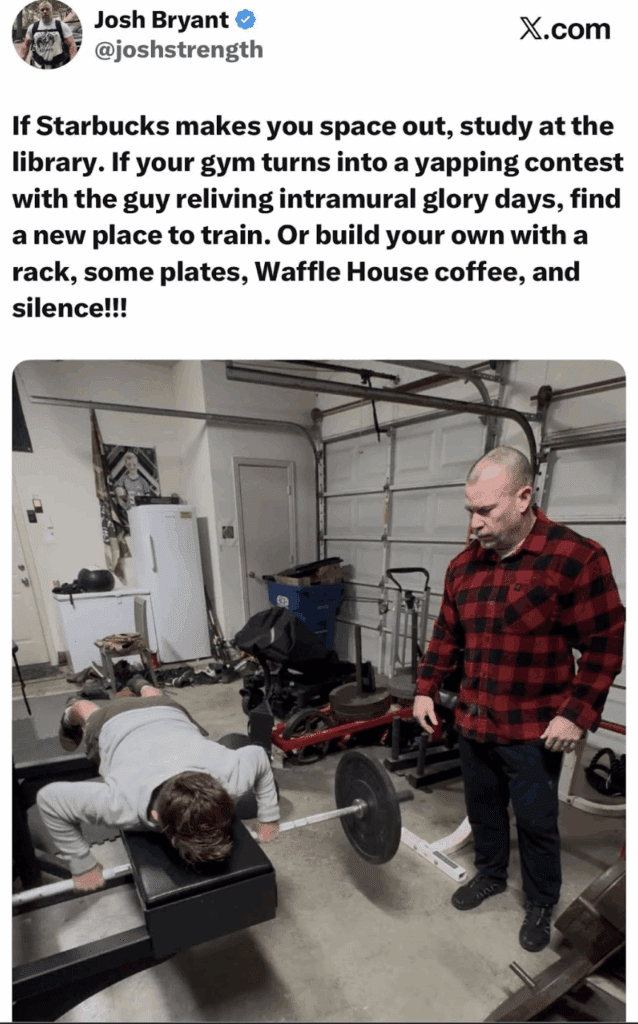 If Starbucks makes you space out, study at the library. If your gym turns into a yapping contest with the guy reliving intramural glory days, find a new place to train. Or build your own with a rack, some plates, Waffle House coffee, and silence.